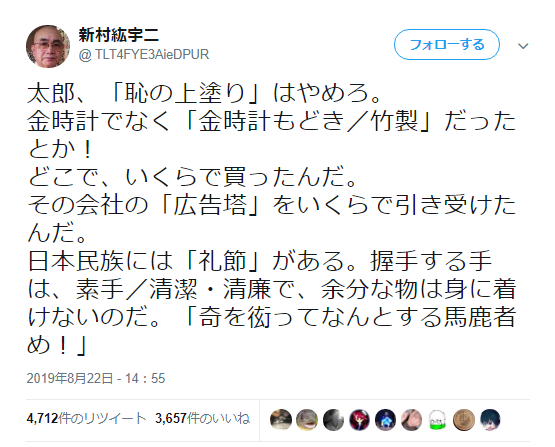 お爺「河野太郎が右手に金時計ひけらかす、恥を知れ!」河野太郎「竹製ですが、何か。」