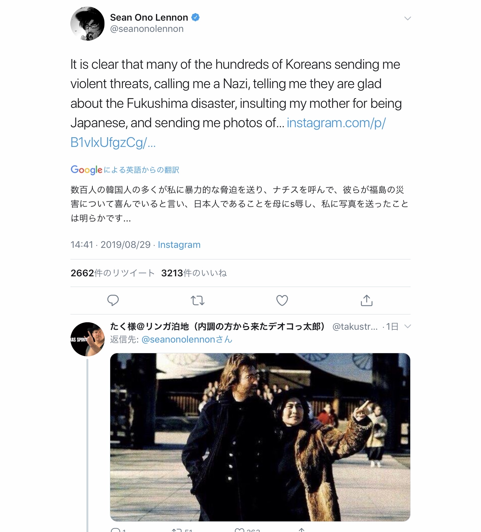 問題のTシャツをミュールにプレゼントしたジョン・レノンの息子ショーン・レノンも「日本で育った私は旭日旗を見れば小さい頃を思い出す。すべての人はそれぞれ象徴的なものを使うことに自由でなければならない」と肩を持つコメントを残して袋叩きにされています。