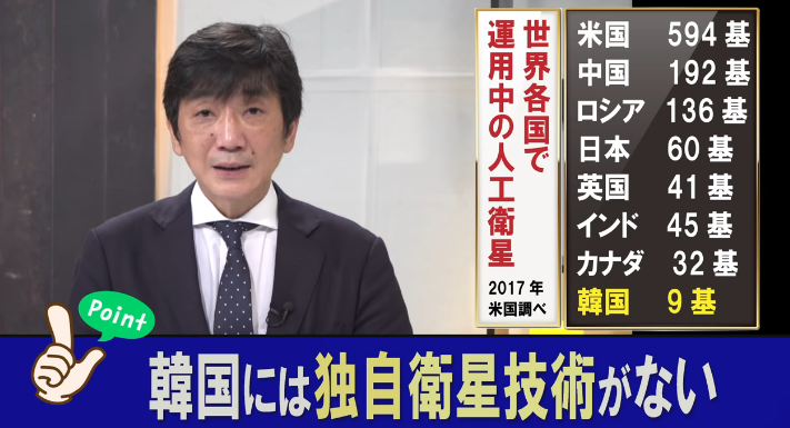 軍事衛星(偵察衛星)の数で比較した方が良いぞ。韓国さんは静かだね。