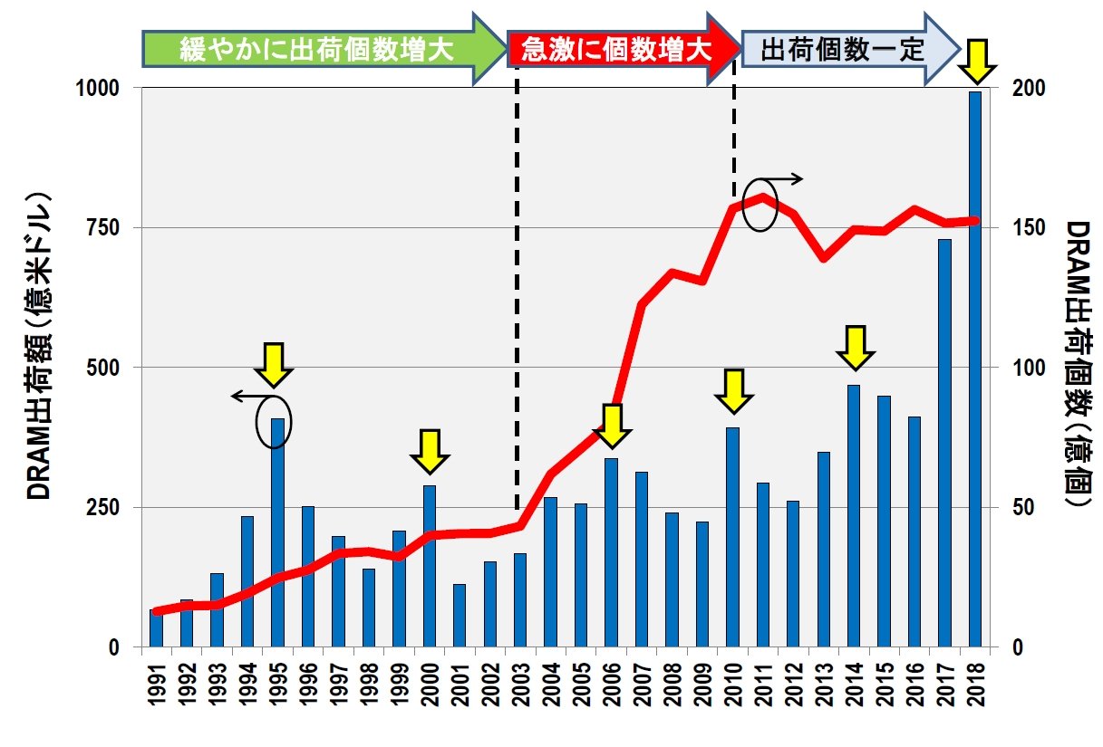 一枚目…DRAM(出荷量:赤線、出荷額:青棒)