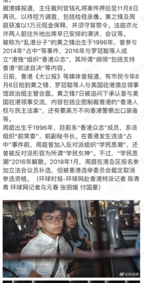 黄氏は雨傘運動で、裁判所の占拠禁止命令に違反したとして法廷侮辱罪で禁錮2月の実刑判決を受け、今年6月に刑期満了で出所したばかり。