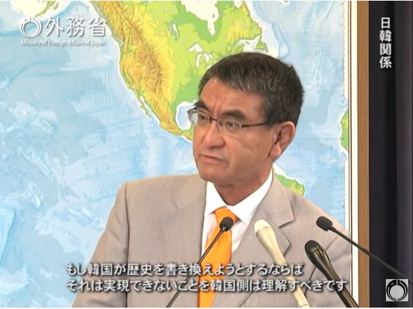 河野外相はこの日午前の記者会見で、外国人記者から「韓国政府が「日本は歴史問題に理解が不足している」と指摘していることについてどう思うか」という質問を受け、「韓国が歴史を変えて書きたいと思う場合、そんなことは不可能であることを知る必要がある」と述べた。