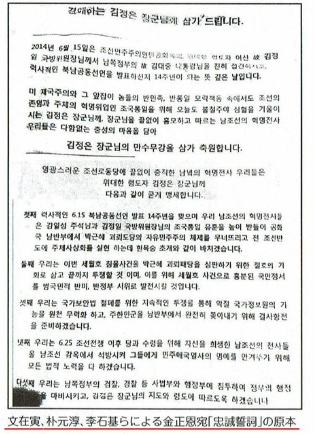 6.我々は、南朝鮮の立法府である国会に進出し、14年前の今日、北南の首領が合意したように、朝鮮半島の主体思想化の為に、南北連邦統一法案を実現させ、将軍様の偉大な構想を実現するための手助けになる、親北的法案を限りなく上程し通過させるでしょう。7.我々は、韓総連の後身である韓大連を通じて、進歩的大学生成年に、主体思想と将軍様の偉大性を強く宣伝し、反米反政府暴動を組織指導し、南朝鮮社会の混乱と葛藤を持続的に醸成していきます。