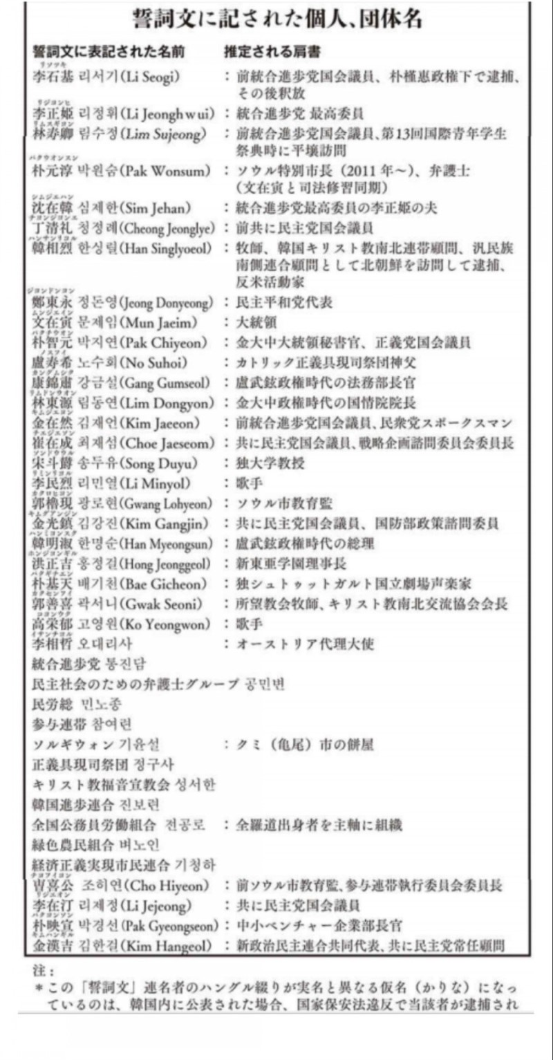 名簿の人物名は北朝鮮風の発音にあわせた表記にしてあるので(つまりあくまで偽名なので)本当の名前ではないため国家保安法対策はされてるとのこと