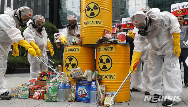 【ソウル=ニューシス】抽象鉄記者=韓国の行商人、自営業者総連合会の会員たちが28日午前、ソウル鍾路区旧日本大使館の前で、日本製品の販売中止を大きく3次記者会見を開き、日本の安倍政権を糾弾し、パフォーマンスをしている。2019.08.28。毎日こんなしょーもない反日デモやパフォーマンスして民度低いなぁ^^;