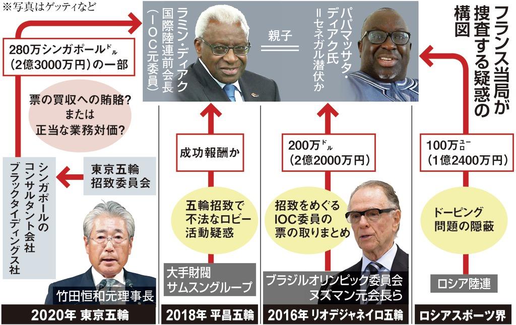 疑惑の中心にいるのは、IOC元委員で国際陸連(IAAF)会長も務めていたセネガル人のラミン・ディアク氏と、その息子でIAAFの運営に関与していたパパマッサタ・ディアク氏だ。親子をめぐっては2015年、ロシアの陸上界から広がった同国の組織ぐるみのドーピング問題で、隠蔽をもくろむロシア側から賄賂を受け取った疑惑が浮上。IAAFの本部がモナコにあることから、モナコの司法権を持つフランス当局が捜査に着手した。