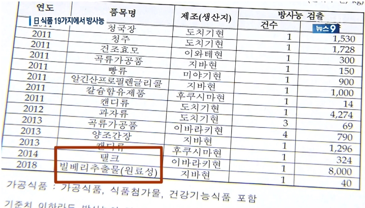 최근 5년간 방사능이 검출된 일본산 가공식품은
