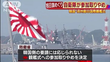 韓国は、旭日旗掲揚を嫌い、各国に「中央マストに韓国と各国の国旗を掲揚してほしい」「艦首と艦尾には旗は掲揚しないでほしい」と要請する体裁をとった、海上自衛隊は「国際法に裏付けられた海軍の常識から見て、降ろす選択肢はない」として、護衛艦派遣を見合わせる措置をとった。