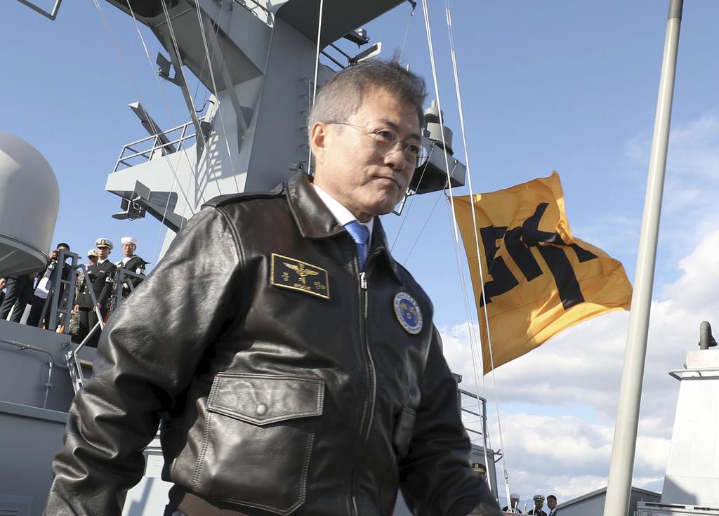 観艦式では、韓国側は自国の国旗と韓国の国旗だけを掲揚するのが原則と通知しておきながら、観艦式では文在寅大統領が演説した艦艇のマストに李舜臣将軍が使ったものと同じデザインの旗を掲揚。