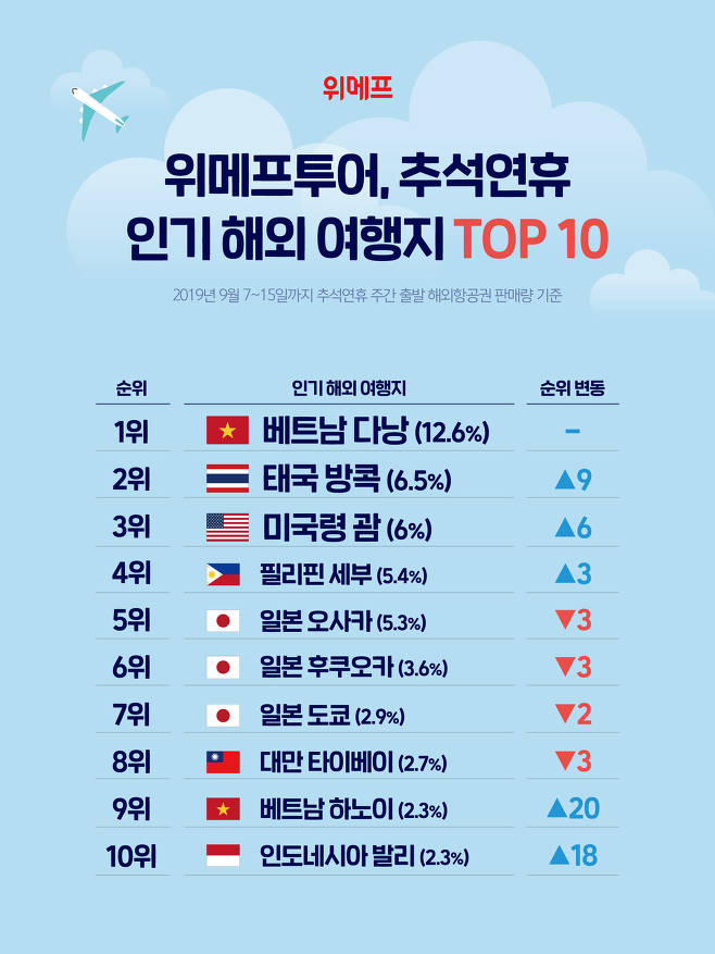上記メプの今年の秋夕連休週間予約の割合上位5つの都市は、ベトナムダナン(12.6%)、タイバンコク(6.5%)、米領グアム(6%)、フィリピンセブ(5.4%)、大阪(5.3%)の順となっている。