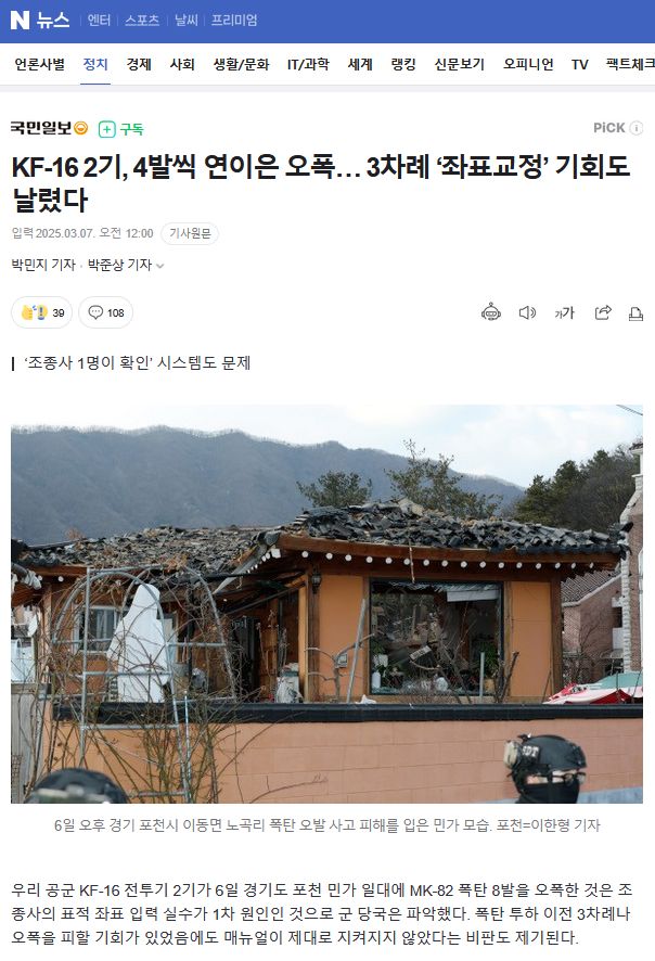 韓国空軍のKF16戦闘機2機が6日、京畿道抱川(キョンギド·ポチョン)の民家一帯にMK82爆弾8発を誤爆したのは、操縦士の標的座標入力ミスが1次原因であると軍当局は把握した。 爆弾投下以前に3回も誤爆を避ける機会があったにもかかわらず、マニュアルがまともに守られなかったという批判も提起されている。