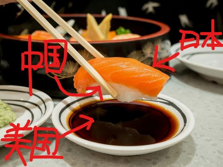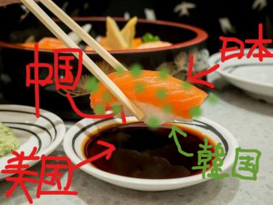 強烈過ぎて、吹いたwサーモンが欧米でシャリが中華、醤油がジャパンだな。
