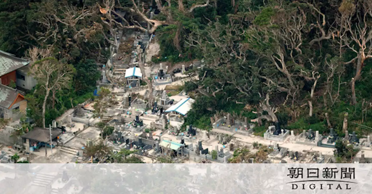 式根島では倒木が墓石や道に覆いかぶさったままになっていた=2019年9月13日午後、東京都新島村、朝日新聞社ヘリから、川村直子撮影
