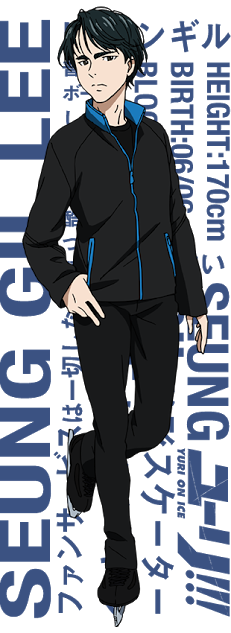 イ・スンギルは韓国の選手。「ストイック」「試合になると変貌」「美形スケーターとして人気」といった設定。また、犬を飼っている模様。元祖はあしたのジョーの、金竜飛だな、