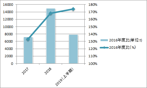 2016年度比で増加したフッ化水素輸出量(単位はt、kgじゃないよ)