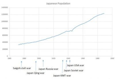1920年の中国内戦中では年間150万人ずつ増えています。その直前の年は500万人増えていたので、増え方は激減しています。民間の死者も年間あたり数百万人いたでしょう。