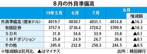 韓国銀行(中央銀行)が4日発表した2019年8月末時点の外貨準備高は4,014億8,000万米ドル(約42兆8,600億円)と、前月末から16億3,000万米ドル減少した。韓国銀行は「米ドル安の進行により、外貨建て資産の米ドル換算額が減少した」と説明した。