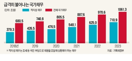 政府は、このような超拡張財政政策を2023年までに続いて行くことにした。国家財政運用計画によって2021〜2023年 GDP比の管理財政収支が毎年-3.9%が出るように赤字財政を組んうと明らかにした。毎年赤字をナニー国の借金が増えるのは当然の手順。中央政府と地方政府の負債国の債務(D1)は、昨年の680兆5000億ウォンから来年805兆5000億ウォンで走っ2023年(1061兆3000億ウォン)円1000兆ウォンさえ突破する。同じ期間 GDP比国家債務比率は36.0%から46.4%に急騰見通しだ。