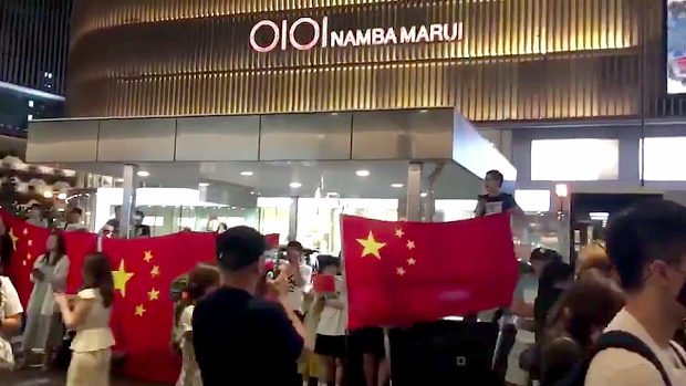 大阪での香港支援デモに、中国国旗をもった在日中国人どもが大騒ぎ。