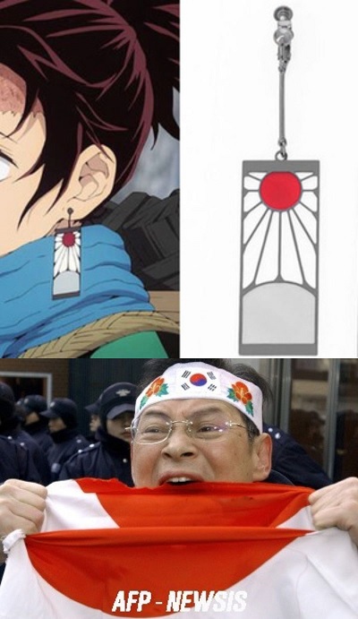 なお、主人公・炭治郎が身につける耳飾りには旭日旗の意匠が描かれており、韓国版では今回の映画を含めて、そのデザインが変更されている。