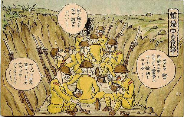 画像は、塹壕中の食事(軍隊漫画絵葉書・荒井一壽)生活保護に刑務所、そりゃこれだけ待遇が良ければ韓国で乞食やってるより快適だろ