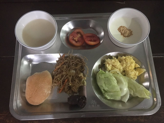汁物はさすがに別盛りだが、金属トレー直だとご飯やおかずは冷めやすいだろうね。