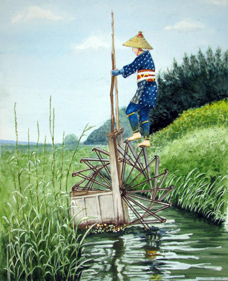 日本は昔に樽みたいな物に羽を付けて横にして樽の軸に棒を通し小川に