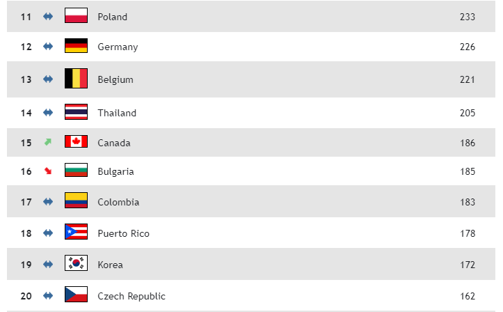 韓国 (14位)226 → 172(-54ぽイント)5ランクdown ↓(19位)