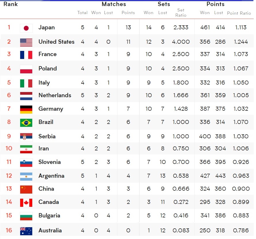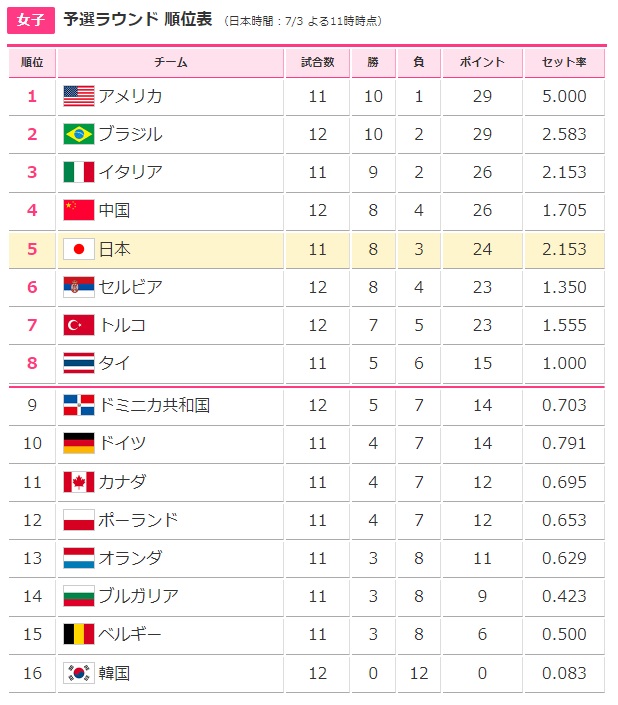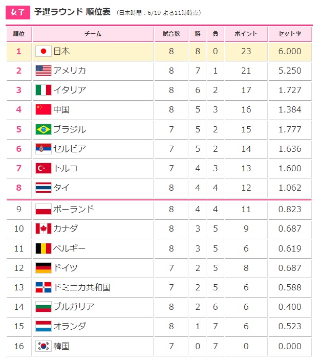 後は、現在8位のタイがどうなるかですが、ドミニカ共和国は全試合終了して、勝ち点が足りず脱落、ポーランドは最終試合に勝ってもセット率で追いつけませんから脱落。