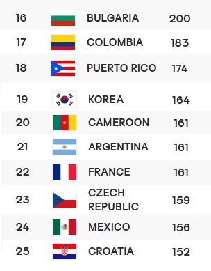 韓国は、トルコから1セット取らせてもらったおかげで、残り試合に全て負けても、23位まで落ちることは無さそうですが、僅差で22位になりそうです。上位とのポイント差がだいぶ離れてしまったので、負けた時のマイナスポイントも少なくなりました。多分1セットでも取れれば20位止まり。