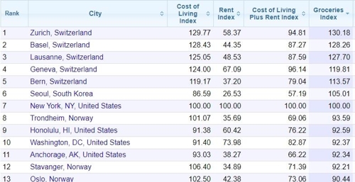 ソウルより食料品物価が高いのは、殺人的な物価で有名なスイスの都市だけだった。チューリッヒは130.18で全体1位を占め、バーゼル(128.26)、ローザンヌ(127.70)、ジュネーブ(119.81)、ベルン(113.57)などが続いた。
