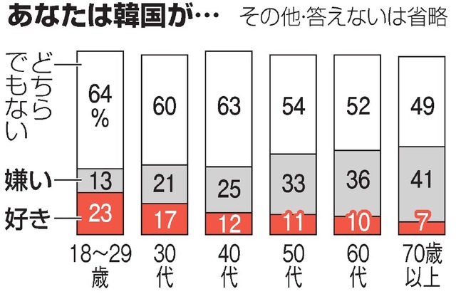【朝日新聞】韓国「嫌い」、年代上がるほど多い傾向