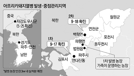 ひとつ注目すべきことは、坡州農場が非武装地帯(DMZ)から20キロメートルほど離れたところに位置しているならば、この日に確定判定が下された漣川農場は5キロメートル内外に過ぎないほどASF発症国の北韓と近いという点だ。しかし鉄柵が二重に遮断しており、監視カメラなどがあってイノシシが北韓から越えて来るとことは事実上不可能であり、捕捉されたこともないと農食品部は明らかにした。環境部もこの地域はイノシシの生息する可能性は低く、川を遡ってイノシシが流れ込むことはないものと分析した。