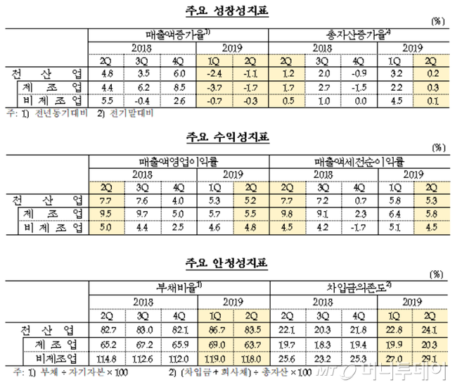 韓国銀行が17日に発表した「2019年第2四半期の企業経営分析」によると、第2四半期ウェガム企業の売上高の増加率は、前年同期比-1.1%となった。前期(-2.4%)に続いて逆成長したものである。