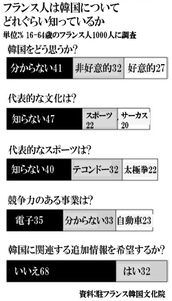 しかし、韓国を知ってはいても、正しく知ってはいなかった。韓国の代表的な文化を質問すると、半分が「知らない」と答え、残りのほとんどの人が「サーカス」と答えた。時々、ヨーロッパのTVで紹介される中国のサーカス団を韓国のものと勘違いしているからだ。このほかに「外部と断絶した閉鎖的な国」または「政治犯が多く受容されている国」と、回答した人もいた。10人中7人(68%)は「韓国について知りいと思わない」と回答し、衝撃を与えた。要するに、ほとんどのフランス人は韓国に全く関心がないということだ。