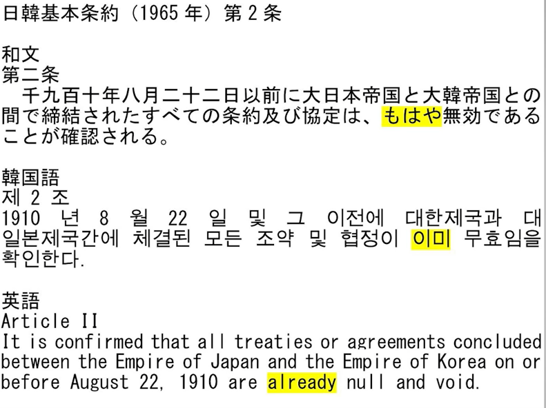 この両国の根本的な主張の違いを、あの有名な「もはや無効」という表現で曖昧にしたのが、1965年6月22日に締結された日韓基本条約の第二条である。