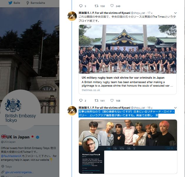 「英国大使はこれまでに、神社を訪問しないようにと誰かに指示したことはありません。実際、大使は今朝、英国の国際通商大臣の明治神宮訪問に同行しましたし、これまでも多くの英国閣僚と神社を訪れてきました。英国は日本の伝統と文化を尊重しています」(英国大使館報道官)BBCも自分らのしたことを棚上げして基本反日だからイギリス人は信用ならん