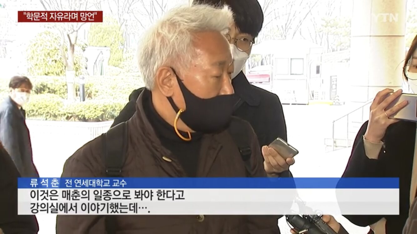リュソクチュン延世大社会学科教授(前の自由韓国党革新委員長)が講義中の学生を相手に日本「慰安婦」被害者お婆さんを「売春婦」と比喩して論議があると思われる。類教授は、現在、性産業従事者の女性が「住みにくく者半分、他意半分」で売春に出ると、「過去(日本植民地時代)もそうだった」と主張した。