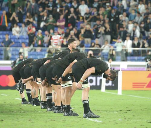 【ラグビーW杯】オールブラックスが南アフリカとの激戦後にスタンドにお辞儀をする