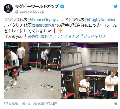 フランス代表@FranceRugby 、ナミビア代表@RugbyNamibia 、イタリア代表@ItalrugbyJP の選手が試合後にロッカールームをキレイにしてくれました