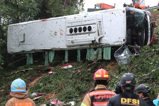 大雨でスリップでもした?第17号台風「打破」の影響で、京釜高速道路雨道に市外バス10m墜落···1人が死亡、1人重体