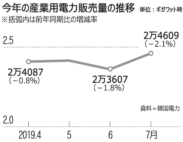 韓国電力公社が22日に発表した電力統計速報によると、月別の産業用電力販売量は4月から7月まで4カ月連続で前年同月と比べ減少した。