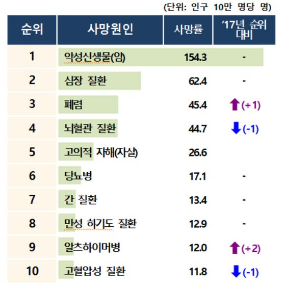 統計庁が24日に発表した「2018年死亡原因統計」によると、昨年自殺による死亡者数は1万3670人で、前年より1207人(9.7%)増加した。人口10万人当たりの死亡者数である自殺死亡率は26.6人で、前年より2.3人(9.5%)増加した。特に、3月(35.9%)、1月に(22.2%)、7月に(16.2%)に大幅に増加した。年齢でみると、80歳以上を除く全年齢層で増加しており、特に10代(22.1%)、40代(13.1%)、30代(12.2%)から大幅に増加した。