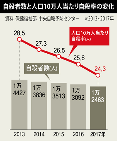 どれだけ奴隷契約なんだよ。保健福祉部と中央自殺予防センターが公開した「2019自殺予防白書」によると、2017年の韓国の自殺者数は1万2463人で、2016年の1万3092人より629人減り、4.8%の減少率を記録した。人口10万人当たり自殺者数(自殺率)は2017年には24.3人で、2016年の25.6人に比べて1.3人(5.1%)減少した。自殺者数が最も多かった2011年の1万5906人より3443人減った。