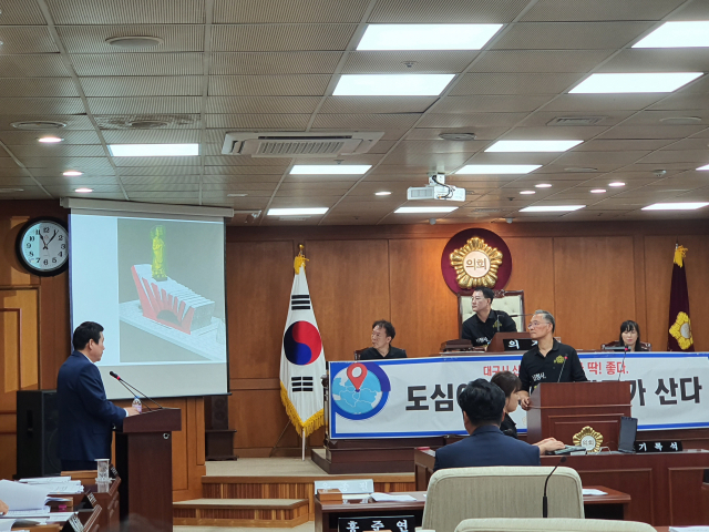 大邱市中区議会会議場の時ならぬ日本の戦犯機(旭日旗)が登場した。歴史歪曲とダークツーリズムによる撤去論議が起きている中区従う皇帝語道像の足場部分が戦犯基連想するという主張が提起されたものである。