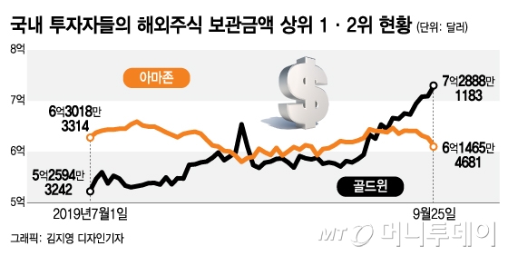 今年上半期だけでも、国内の投資家が最も多く産株はアマゾンであったゴールドウィンがその次だったが、格差は徐々に減って10日ゴールドウィンとAmazonの保管量がそれぞれ6億5456万ドル、6億4196万ドルで、1・2上記順位が変わった。以後、現在まで保管金額の格差はさらに広がっている。