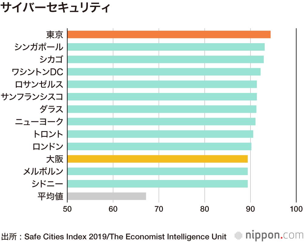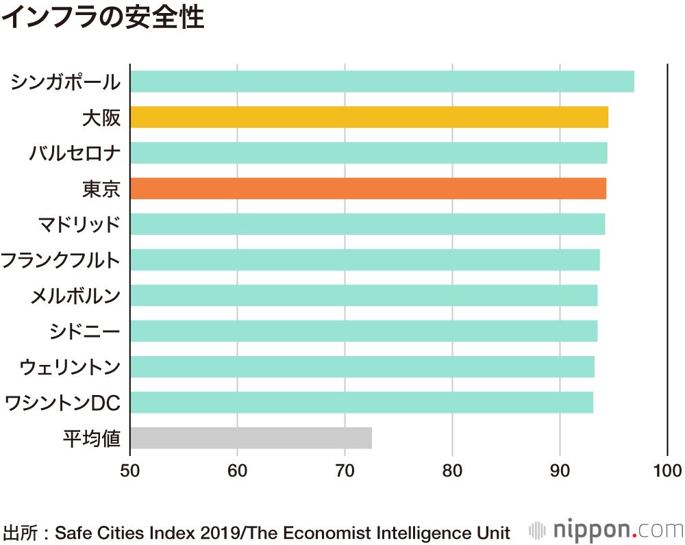 2019年世界で最も安全な都市ランキングでは、東京が平均92点(100点満点)で2015年、2017年に続き1位となった。以下、シンガポールが2位、大阪が3位に入った。