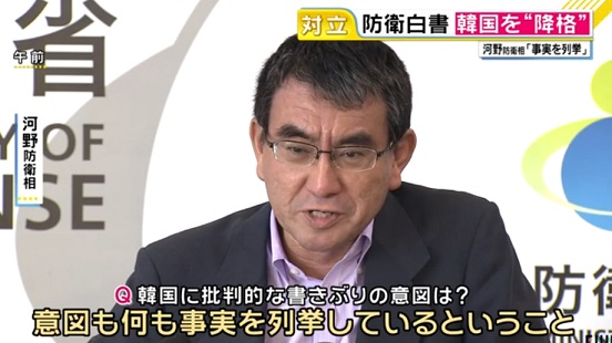 河野防衛相は、「(韓国に批判的な書きぶりの意図は?)意図も何も、事実を列挙しているということ」と述べた。