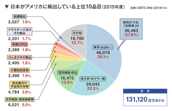 第2位は「原子炉・ボイラー等」。ご存知のように、日本では全国に原子力発電所を設置し電気を供給している、そうした設備や部品を海外にも輸出していて、アメリカもその相手国のひとつ。(原子力協定を結んだ国のみ)