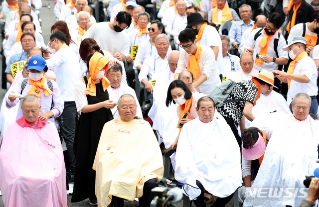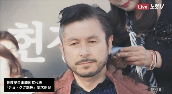 【ソウル=ニューシス】イヨウンファン記者= 28日午前、ソウル鍾路区光化門広場の近くで国を守る高校連合のメンバーが祖国法務部長官とムン・ジェイン大統領退出を促し断髪式をしている。2019.09.28。